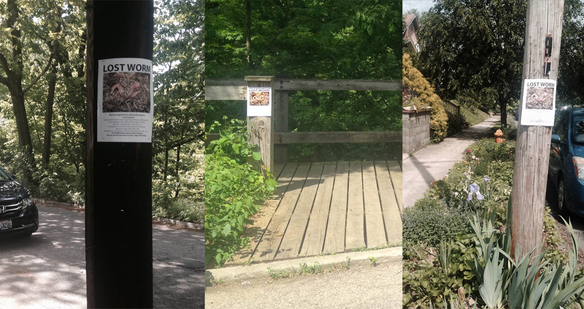 By Ruth Burke Can You Help Me Find My Worm is a street-art influenced flyer project. There are over 15 “LOST WORM” flyers posted on street poles in various neighborhoods from central to southeastern Ohio. Using absurdity, humor and the most basic technique to find a lost pet, the flyer asks the reader to consider a potential relationship between humans and worms while sharing positive aspects of keeping worms (eg. they will eat your garbage). Flyers are posted on common dogwalking routes in my neighborhood. Many people that have companion animals will read “lost pet” flyers and hopefully be amused by the absurdity. The flyer provided a bit.ly shortcut to building your own worm bin on instructable.com. The project can be qualitatively assessed by linking Google Analytics to the Instructable article and tracking the bit.ly as the referral source.